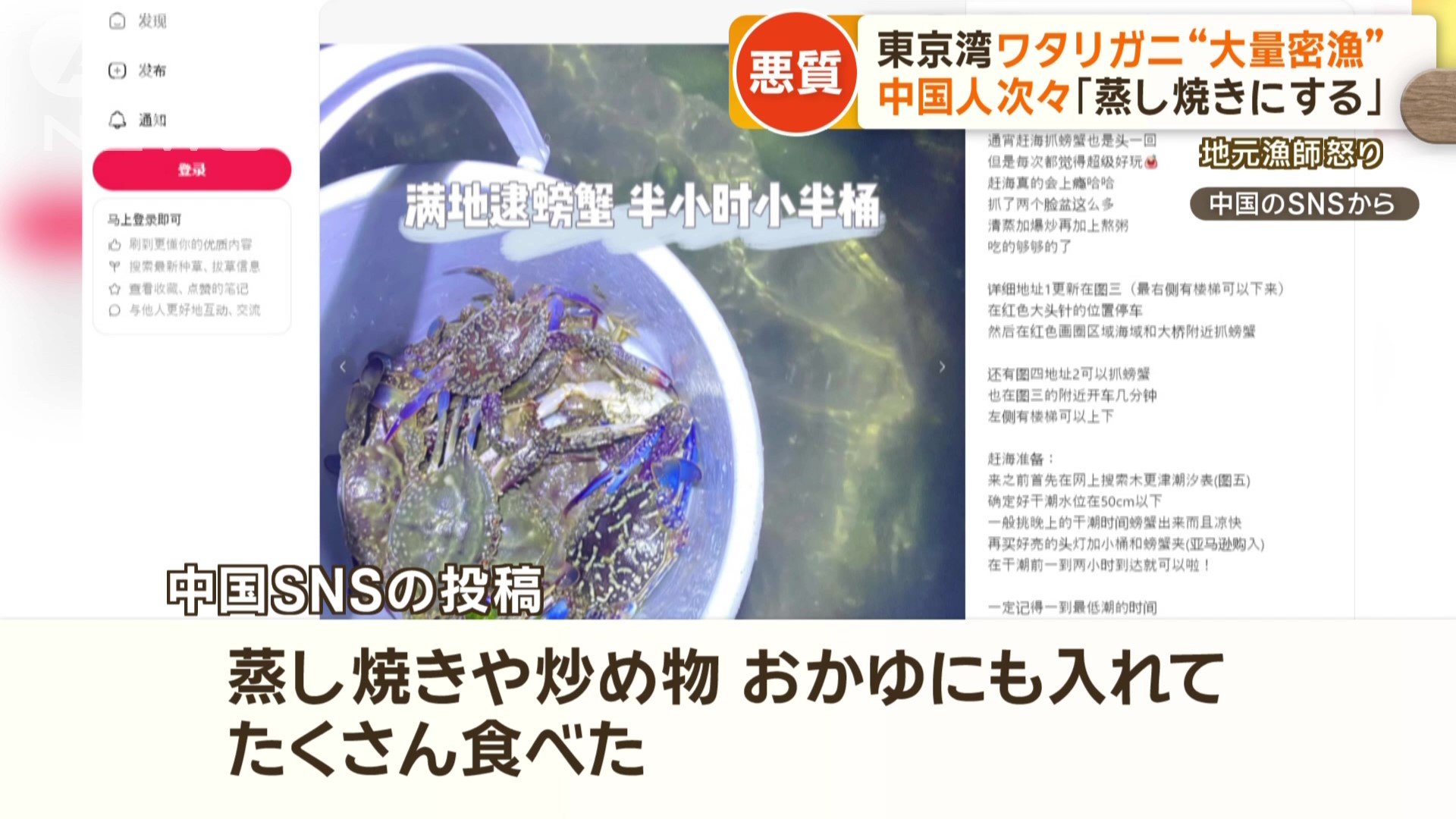 中国のSNSを調べてみると、「大漁、木更津潮干狩り」「バケツ2杯分とれた。蒸し焼きや炒め物、おかゆにも入れて、たくさん食べた」など、ワタリガニの動画や画像と共に「木更津」と書かれた投稿が多数見つかりました。画像の中には、捕獲したワタリガニで作った料理もあります。